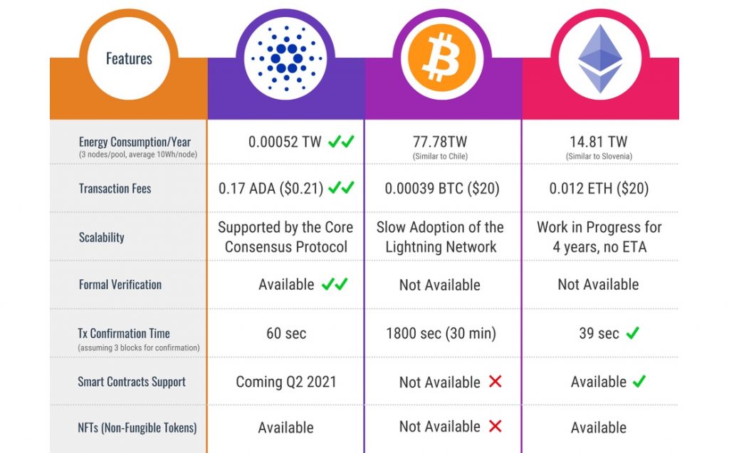 Cardano är baserat på Ouroboros Proof-of-Stake blockchain-protokoll, som påstås vara fyra miljoner gånger mer energieffektivt än Bitcoin (BTC). Den resulterande energiskillnaden kan jämföras med energianvändningen för ett hushåll (ADA) mot ett litet land (BTC). Intressant nog är Ethereum i färd med att flytta från ett Proof-of-Work-protokoll till ett Proof-of-Stake, vilket utan tvekan visar att tekniken är högt ansedd i branschen.