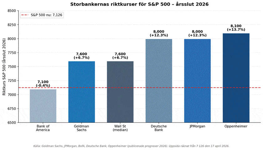 Storbankernas riktkurser för S&P 500 till årsslut – från BofA:s sidledes till Oppenheimers +13,7 procent. Hunter ligger långt ovanför.