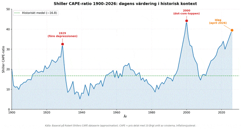 Shiller CAPE 1900–2026. Dagens nivå i paritet med 1929 och 2000.