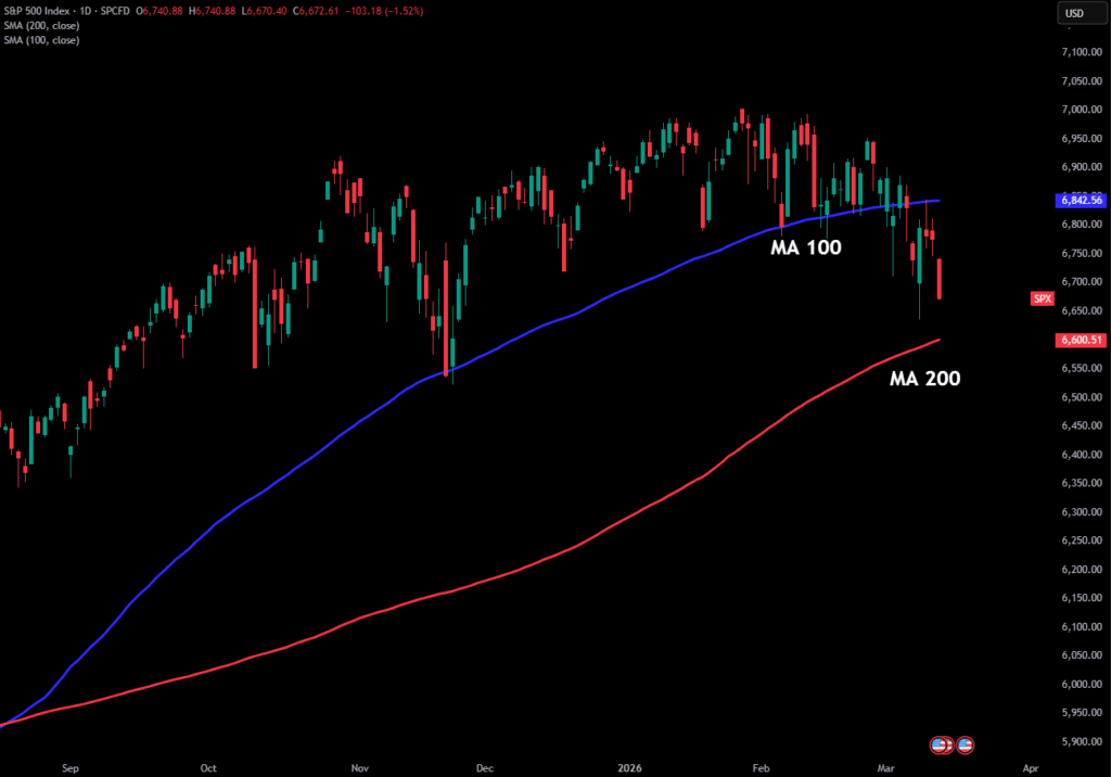 Nu handlas S&P 500 på 6 672 – drygt 70 punkter ovanför MA 200 på 6 600.