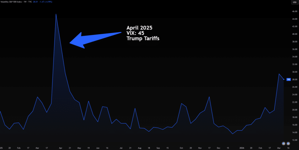 VIX – rädsloindexet – har stigit från runt 15 i januari till 28 nu i mars. Titta på VIX-grafen. Den senaste stora toppen var i april 2025 när VIX nådde 45 – i samband med Trumps tullar. Det var en riktig panikrörelse. Vi är inte där nu, men riktningen är tydlig och rörelsen uppåt har gått fort.