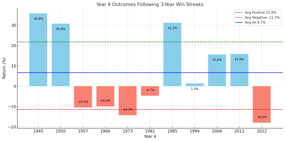 Det här är en fullt rimlig fråga. Tre starka år i rad känns ofta som att det borde sluta med en nedgång. Men historiskt är svaret mer nyanserat än så.
