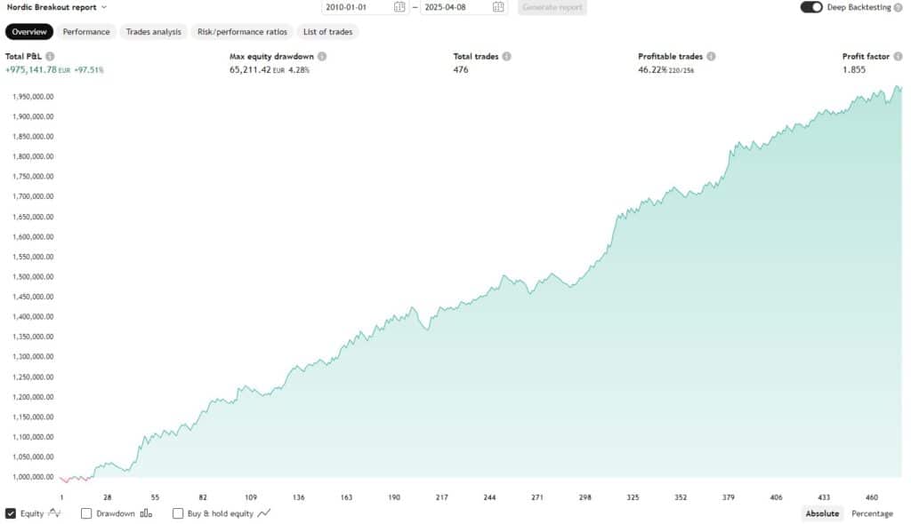 Vi lanserade Nordic Breakout till Tradingview (världens största trading-plattform) i juni 2026. Sedan dess har strategin tagit 13 trades i realtid.
